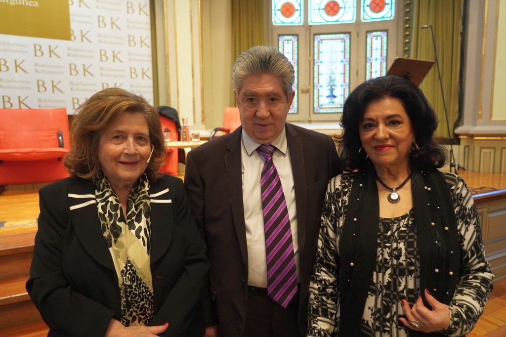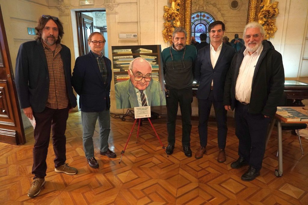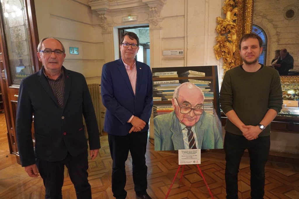 Al llegar al vestíbulo del salón de actos recibía a los asistentes el propio Ángel y a más de uno casi le da un soponcio. Se trataba de un emotivo retrato pintado por José Ramón Muro, vicepresidente de la Asociación Artística Vizcaina, sección Pictórica, y que se le entregó, al cabo del encuentro, al hijo de Ángel, Koldo Ortiz González de Langarika. Todo estuvo organizado por la Asociación Artística Vizcaina que preside Gabriel Rodrigo. La misma Biblioteca Municipal de Bidebarrieta a la que Ángel donó su extensa colección de libros, muchos de ellos personalmente dedicados por sus autores; un espacio tan querido para él. Allí se celebró el encuentro de homenaje al viejo abanderado de la difusión de la cultura.